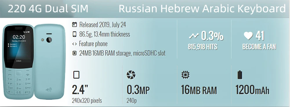 Original 220 4G Dual SIM Mobile Cell Phone 2.4" FM Bluetooth Unlocked Cellphone Russian Hebrew Arabic Keyboard. Made on 2019